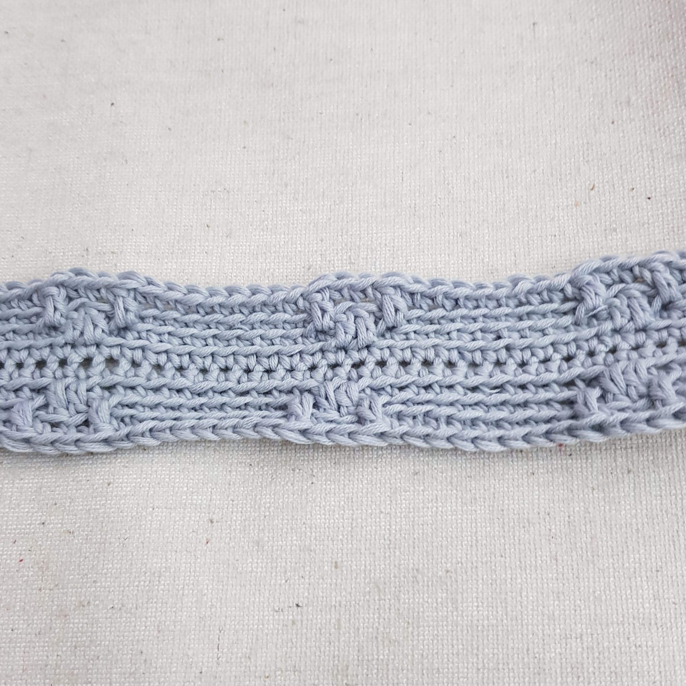 Step 12 – CH 1. Repeat (3 SC in back loop. DC in front loop of SC from previous row. Skip 1 SC. 4 SC in back loop of SC. DC in front loop of SC under the next SC (i.e. DC is in SC from previous row), skip 1 SC, 3 SC in back loop) 12 times. Join to first SC with a slip stitch. (N.b. photos from this point on show one side of the bag only)