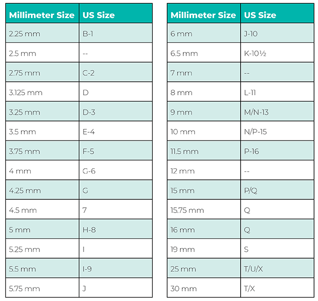 Crochet hooks come in a wide range of sizes. Size can be denoted by letters and numbers (typically used in US) or in millimetres (Refer to the conversion chart below, courtesy of http://www.crochet.com). The choice of which size to use is often determined by the yarn . In fact, most yarn will indicate on it’s label the recommended size to use. Sometimes, however, the choice will be dictated by the pattern you are following. In addition, it will depend a lot on your stitch tension – and you may need to use a different hook size. But, it really is up to you, and you should use whatever hook you feel most comfortable with! I do a lot of projects using DK yarn, so my favourite and most frequently used hook size is 4.0mm (G-6).